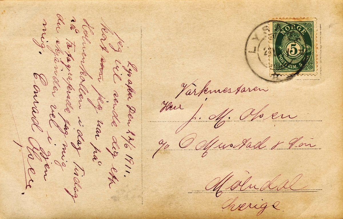 Handskriven, norsk text, på kortets baksida: "Värkmestaren Herr J M Olsen c/o O Mustad & Son, Mölndal, Sverige Lysaker Den 22/6 1911. jeg vil sende dig ett kort jag var på Holmenkollen i dag Tisdag så Fotograferade jag mig du skjänder vel i gjen mig. Conrad Olsen."