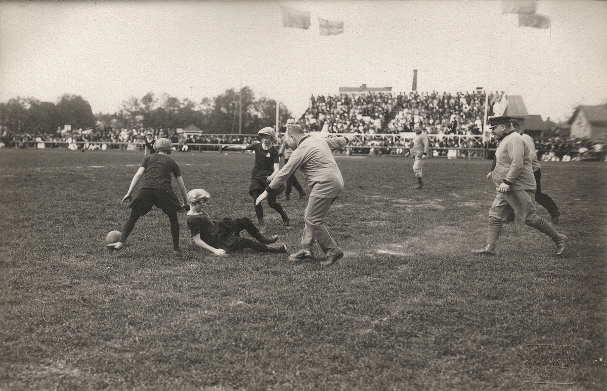 Fotbollsmatch mellan OldBoys och Kvinnliga Gymnastikföreningen på Barnens Dag 1922.