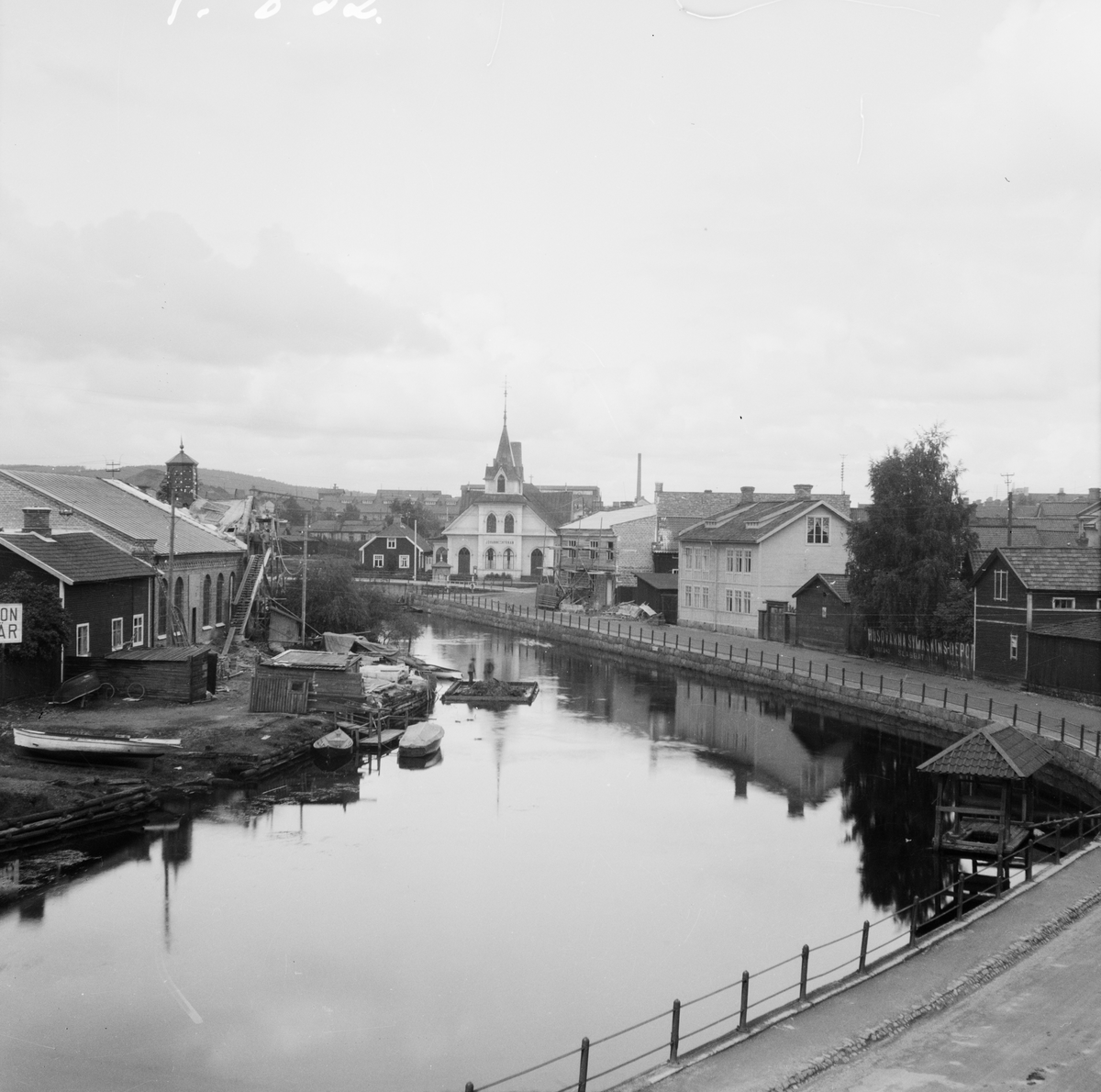 Falun, ån och Östra Hamngatan mot Nybrogatan och Johanneskyrkan.