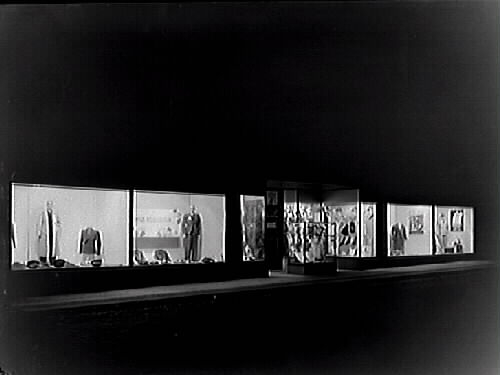 Kvällsbild av skyltförnster till J. Busch, Axel Lindahls eftr. En klädbutik som låg utmed Torggatan i Varberg.