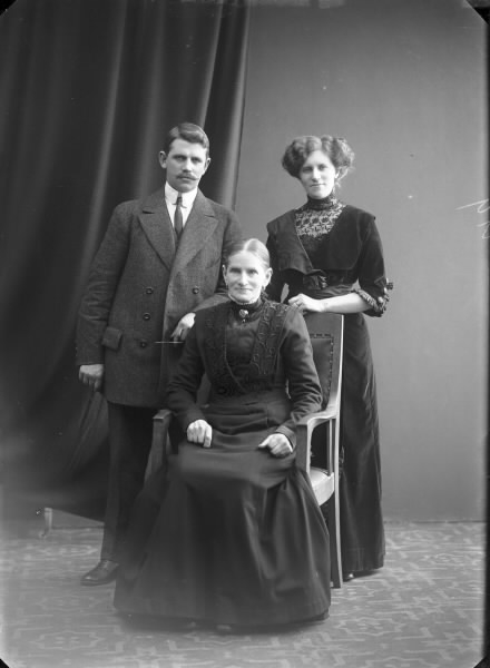 Ateljéfoto av en äldre sittande kvinna och stående bakom henne en yngre man och kvinna. Beställare och/eller avbildad: C Elfver.