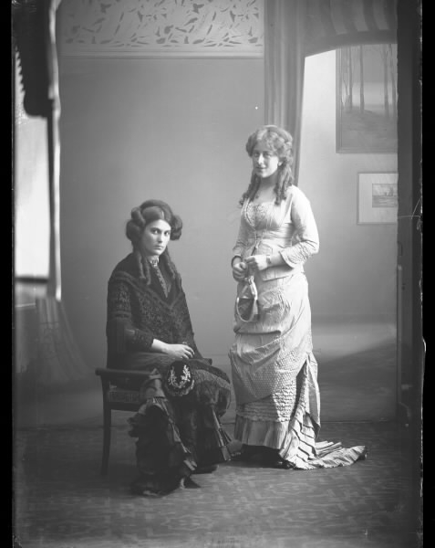 Kvinnoporträtt, ateljéfoto. Två unga kvinnor med långa klänningar, väskor och konstfärdiga håruppsättningar med korkskruvar. Beställt av Leffler. (Se även bildnr GB2_1289, GB2_1290)