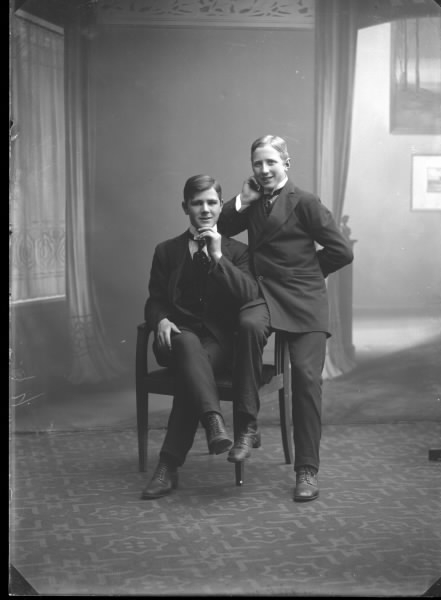 Porträtt av två unga män, pojkar. Ateljéfoto beställt av Nils Strömqvist, Idala.