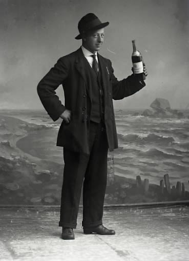 Ateljéfoto av en man som håller i en flaska. Bakgrunden föreeställer en strand. Beställare: Adolf Johansson, Nedragärde Källsjö.