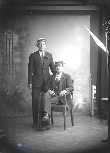 Ateljébild från filialen i Falkenberg med två män i helfigur varav en sitter, båda iförda halmhattar. Beställare: Oskar Pettersson. Hertings vaktstuga.