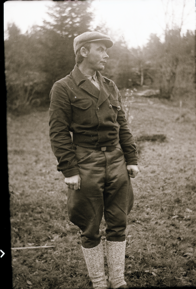 Fotografen själv ute i naturen i midjejacka och med högskaftade raggsockor uppdragna över ridbyxan.