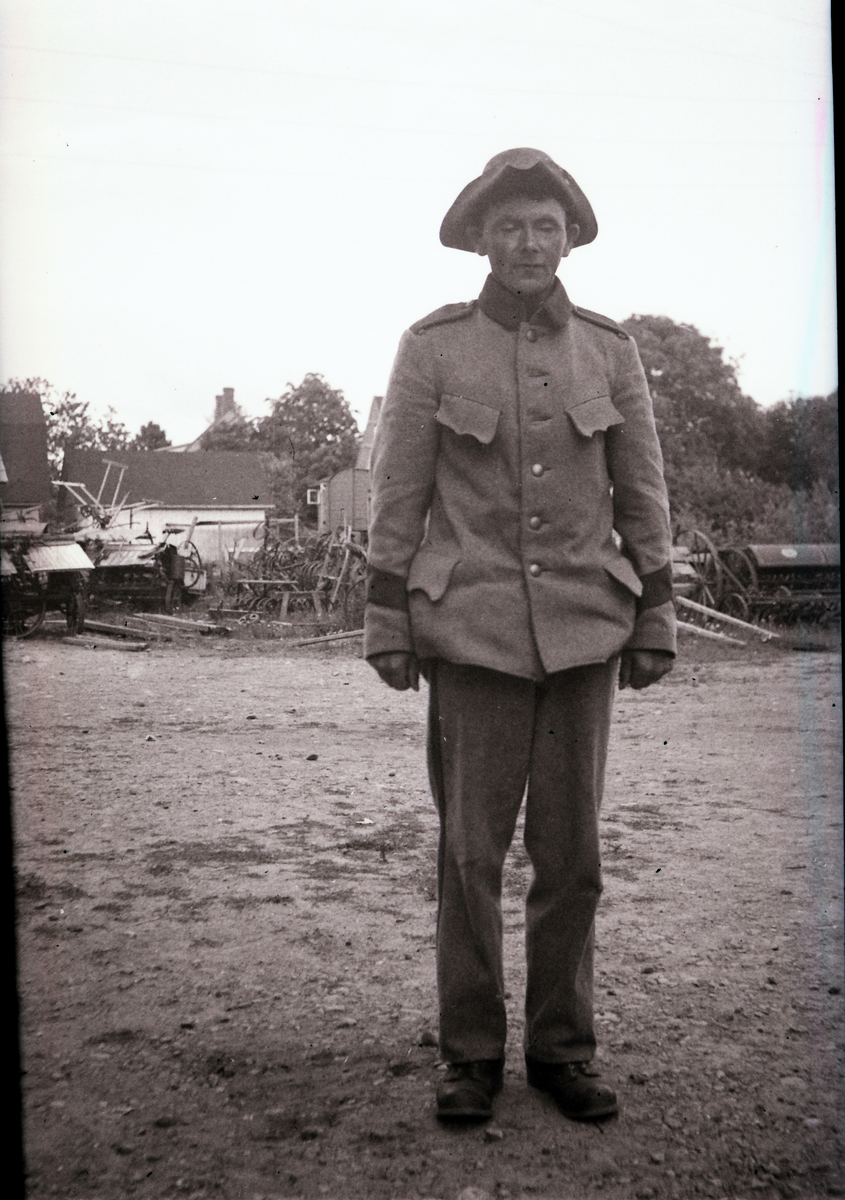Fotografen själv i Landstormsuniform. Den tresidiga hatten kallas trekornshatt och liknar den karolinerna bar på 1700-talet. I bakgrunden ses byggnader och en mängd olika jordbruksmaskiner.