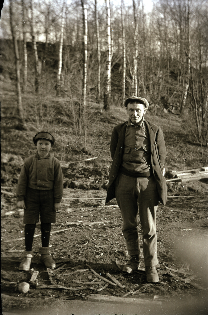 Kloar-Erik tillsammans med en pojke i naturen, med en björkbacke i bakgrunden.
