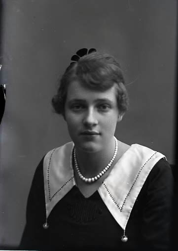 Ateljébild av en ung kvinna med pärlhalsband och stor snibbkrage med kulor eller kanske bjällror. Beställare: Sigrid Svensson, Prästgatan 43, Varberg.