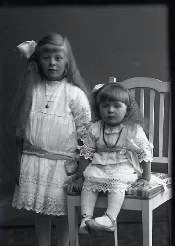 Ateljébild med två små flickor i spetsklänningar. Beställare: Gustaf Karlsson.