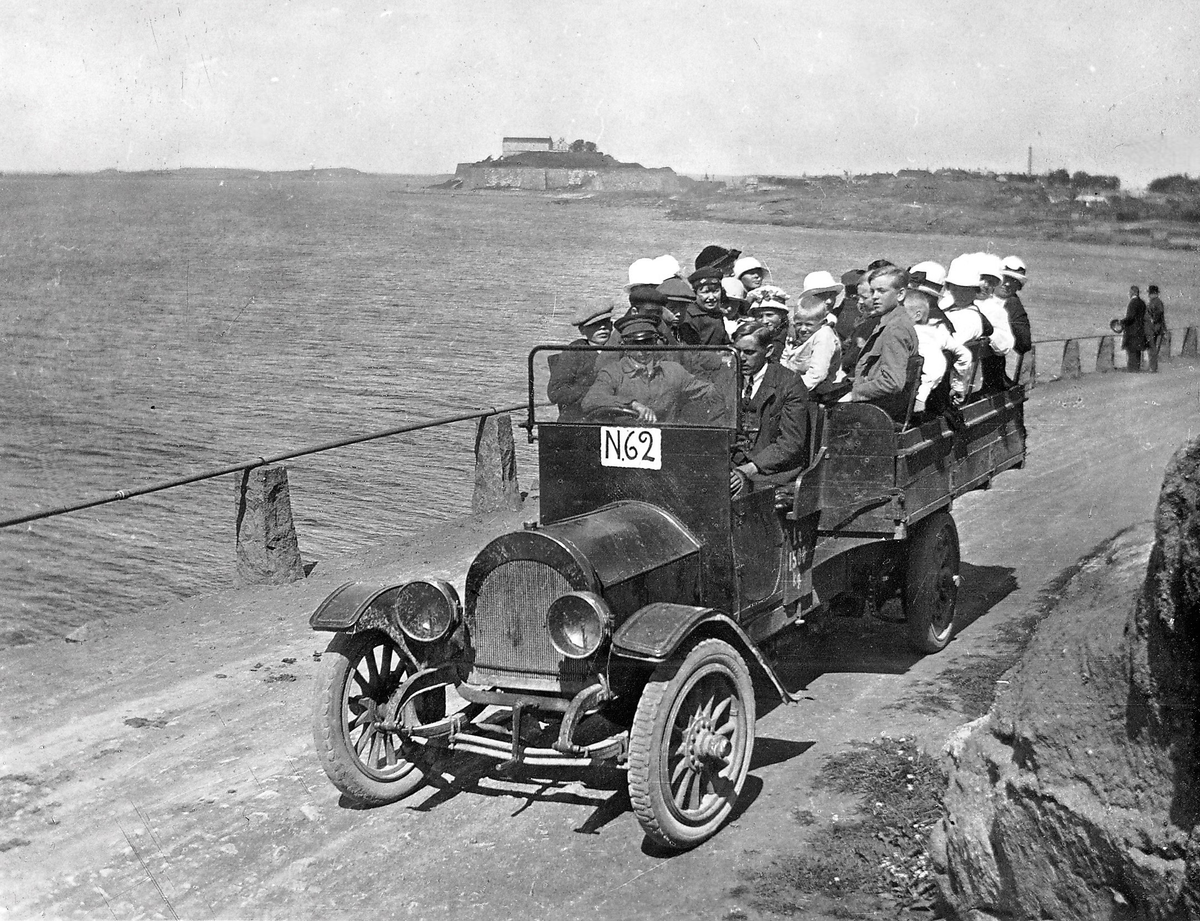 "Utflykt på Pingstdagen". Fullastat flak på bilen med personal och patienter från Kustsanatoriet Apelviken som kör söderut längs strandvägen. Ett par män står vid räcket och betraktar havet och i bakgrunden ses Varbergs fästning. Se även bildnr KSA107.
