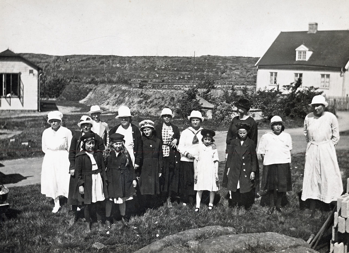 "Vid hemkomsten på Pingstdagen". Efter en bilutflykt (se bildnr KSA106) är de finklädda patienterna hemma igen på Kustsanatoriet Apelviken. Alla bär någon form av huvudbonad.