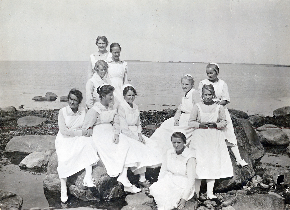 "I kamratkretsen Midsommardagen 1921". Tio unga kvinnor ur personalen vid Kustsanatoriet Apelviken sitter på stenar vid stranden i Lilla Apelviken.