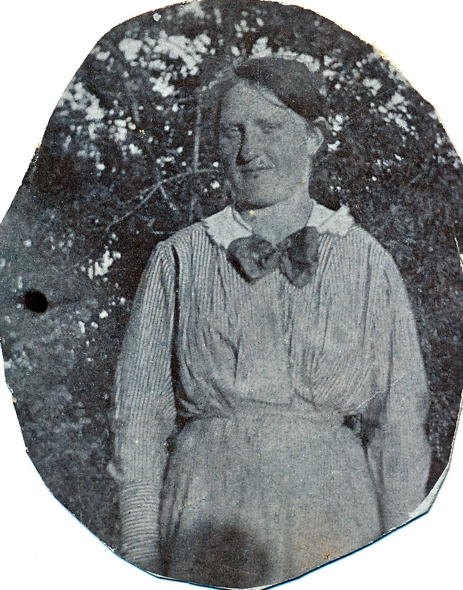Lös bild av ung kvinna som medföljde album med foton från Kustsanatoriet Apelviken. Hon står utomhus och bär en stor rosett vid klänningens halsringning. Uppgifter saknas.