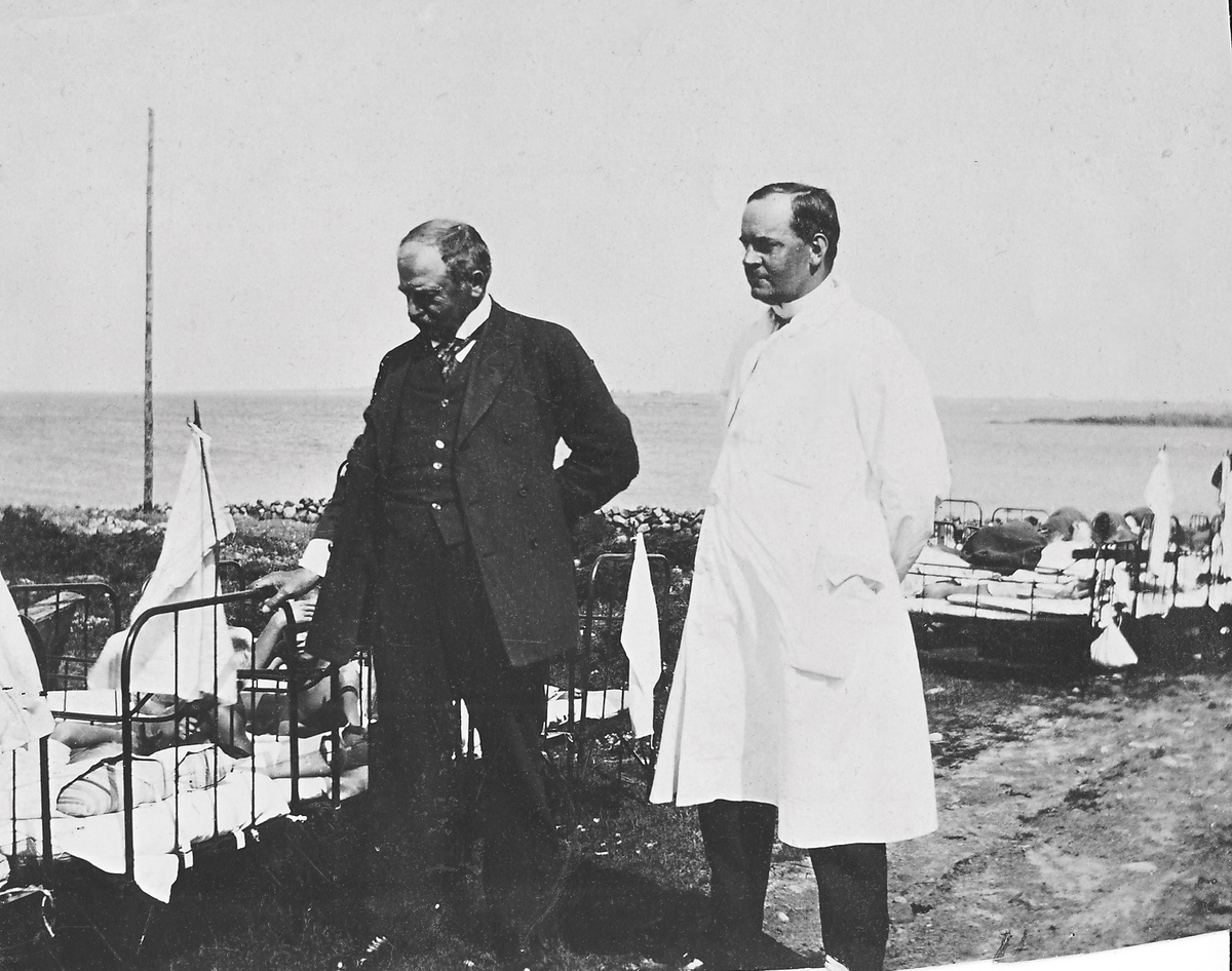 "Dr. Almer och Vikberg på rond." Här står en lång rad med sjuksängar ute direkt på marken vid Kustsanatoriet, med havet i bakgrunden. Sol och frisk luft var en viktig del av behandlingen på sanatoriet. Almer bär kostym och Vikberg en vit läkarrock.