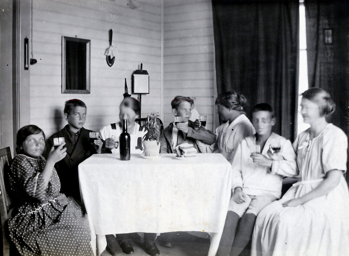 "Det glada laget på Apelvikens extrarum." Flickor och pojkar som dricker saft, varav två par krokar arm. På bordet står ett fat med bröd.