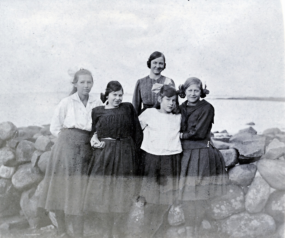 "En gladare min om ja får be." Fem flickor på Kustsanatoriet vid en stengärdsgård med havet vid Lilla Apelviken i bakgrunden. Se även bildnr KSA90 med samma flickor.