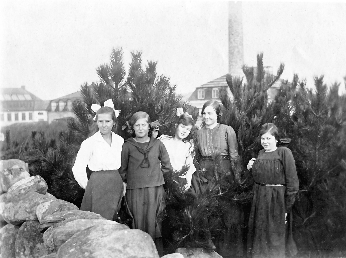 "Fem glada talltrastar." Samma fem flickor som på bildnr KSA89 men nu i ett tallbuskage med sanatoriebyggnader och skorstenen i bakgrunden.
