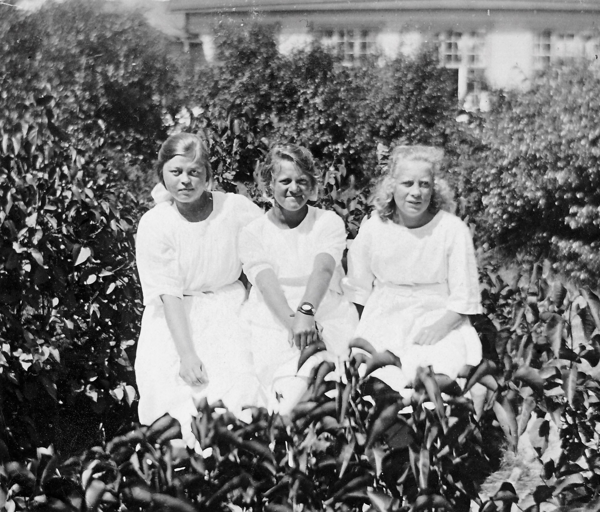 "3 Norrlänningar vid Västkusten." Tre flickor sitter i ett syrenbuskage med sanatoriebyggnad i bakgrunden.