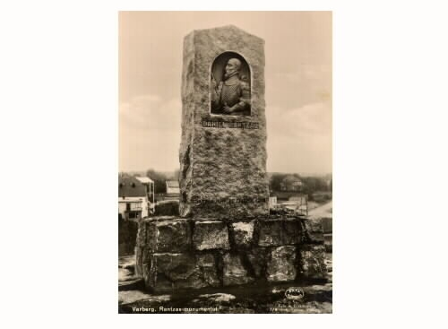 Vykort, "Rantzaumonumentet i Varberg". Minnessten över fältherren Daniel Rantzau som stupade här år 1569 vid strider om Varbergs slott. Stenen invigdes den 26 juni 1938 i närvaro av prins Carl, som invigningstalade, och prins Harald av Danmark samt flera högre militärer från båda länderna.