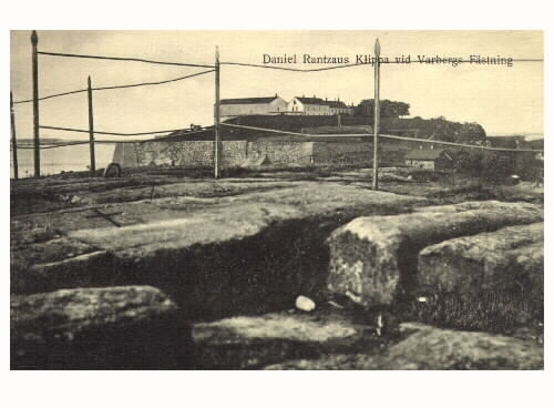 Vykort, "Daniel Rantzaus Klippa vid Varbergs fästning". Vy från klippan där den danske fältherren stupade år 1569 mot fästet danskarna försökte inta. Platsen fungerade som utsiktsplats, därav staketet.