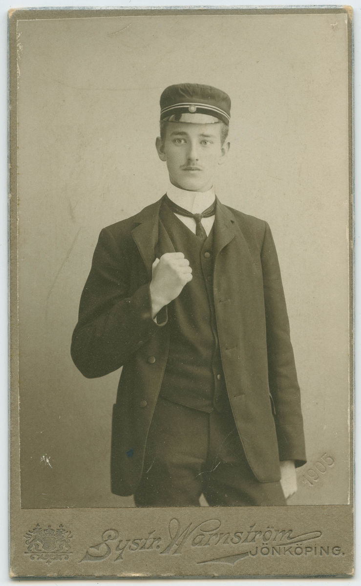 Porträtt på Carlos Sjöstedt. Född i Buenos Aires den 2 maj år 1888 studerade i Jönköping år 1907.