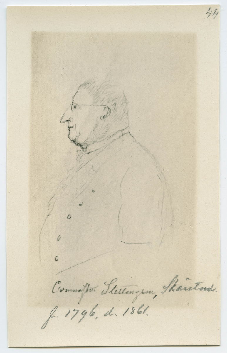 Porträtt på Pehr Gustaf Slettengren.(Tecknat porträtt), Född i Slätthög den 15 mars år 1796. Död den 29 december år 1861. Komminister i Skärstad.