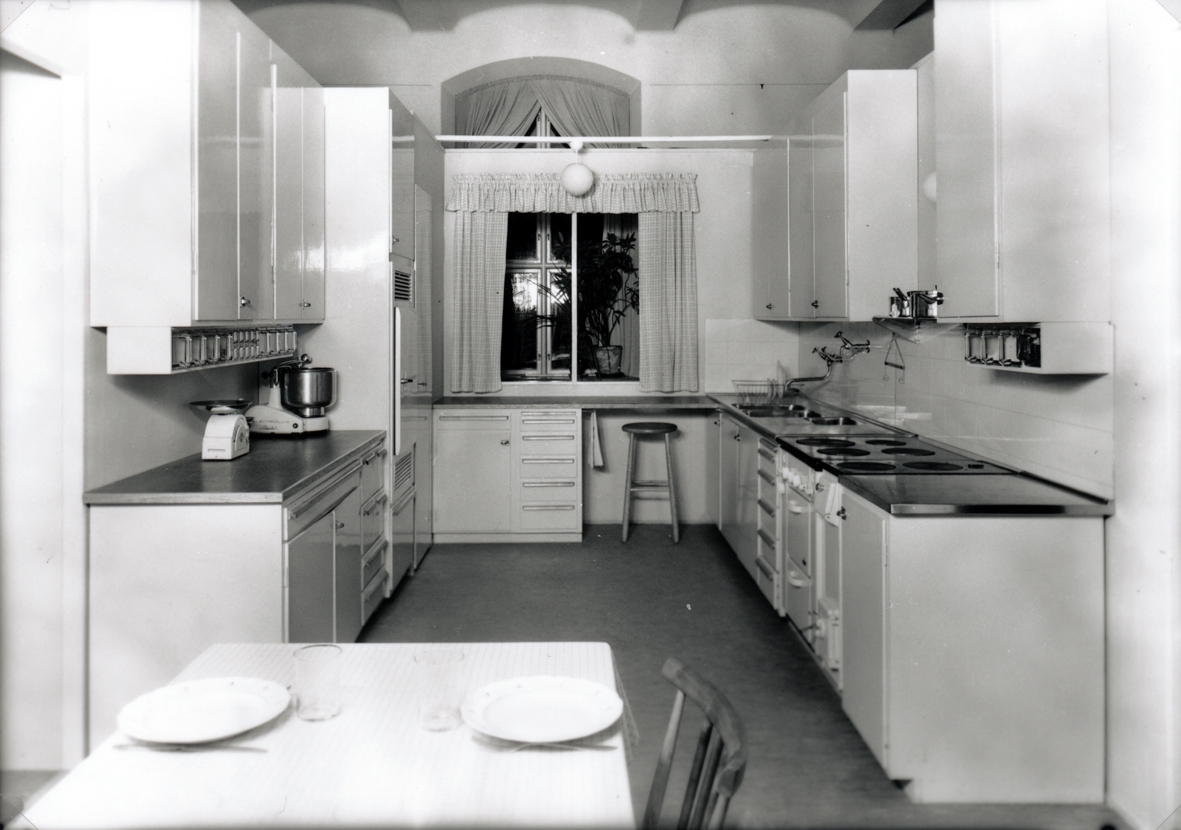Ett mycket modernt kök på 1940-talet. Bilden är tagen i reklamsyfte och vi saknar uppgift om var den tagits. Observera Electroluxassistenten på bänken!
