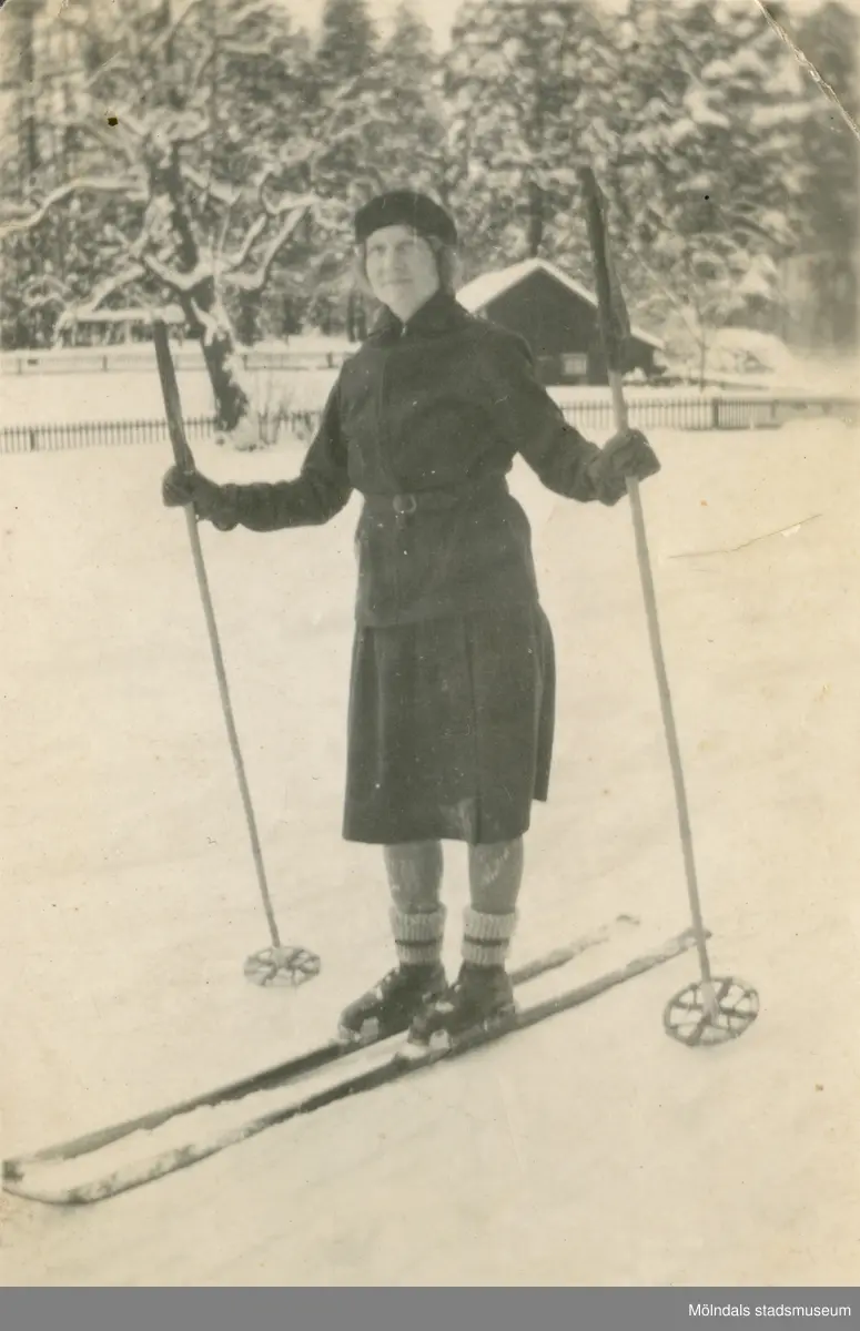 En okänd kvinna står på ett par skidor i ett vinterlandskap troligtvis i Lindome, okänt årtal. Bilder ur fotoalbum från Aina Englund som växte upp i en jordbrukarfamilj i Lindome. Relaterade motiv: 2024_1542 - 1617.