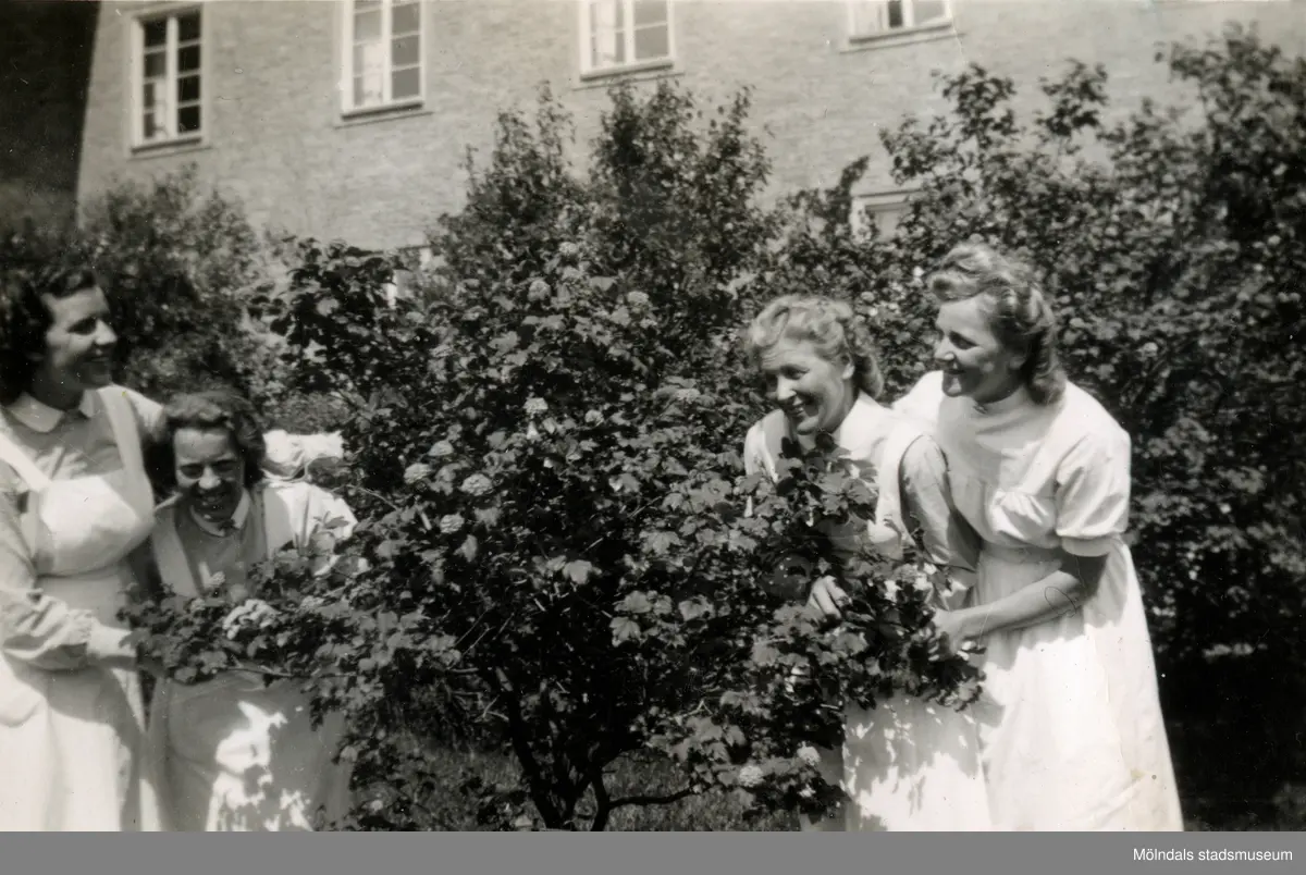 Fyra kvinnliga sjukvårdbiträden/undersköterskor står två och två om en buske och tittar skrattandes på varandra utanför Mölndals sjukhus 1939 - 1941. Bilder från fotoalbum, tagna från södra sidan av Länsmansgatan vid Mölndals lasarett/sjukhus 1939 - 1941 på bland annat givarens mor Ester (född Johansson) tillsammans med kollegan/väninnan Aina Englund. De arbetade på den manliga kirurgavdelningen som vårdbiträden/undersköterskor.