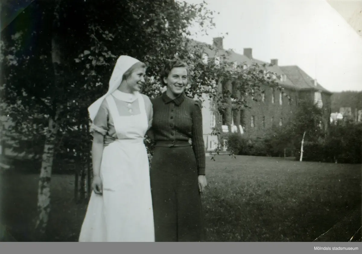 Två kvinnor, ett vårdbiträde/undersköterska och en civilklädd, står på gräsmattan framför Mölndals sjukhus som ses i bakgrunden, 1939 - 1941. Bilder från fotoalbum vid Mölndals lasarett/sjukhus 1939 - 1941 på bland annat givarens mor Ester (född Johansson) tillsammans med kollegan/väninnan Aina Englund. De arbetade på den manliga kirurgavdelningen som vårdbiträden/undersköterskor.