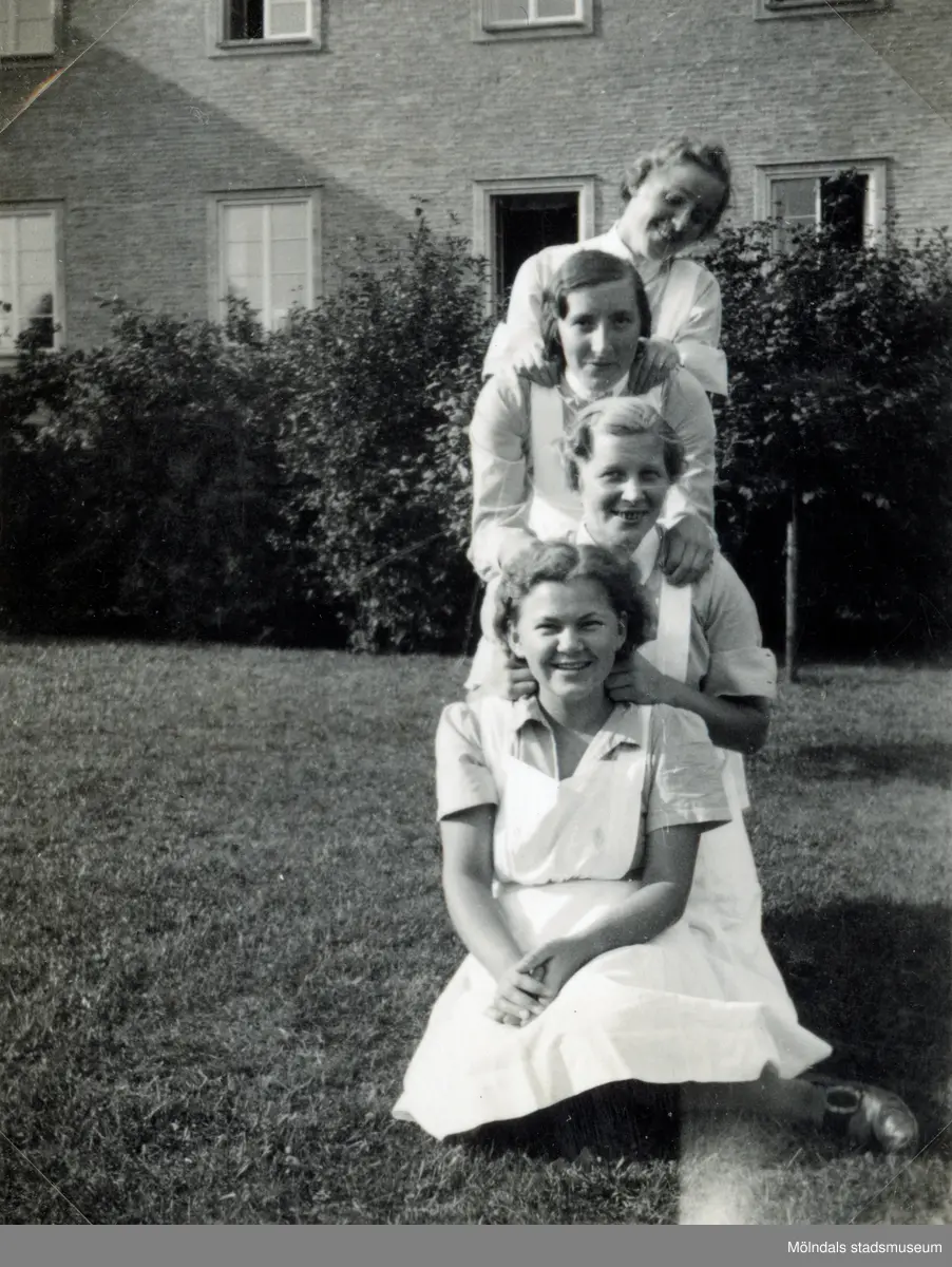 Fyra kvinnliga sjukvårdbiträden/undersköterskor poserar som tripp-trapp-trull på gräsmattan framför Mölndals sjukhus 1939 - 1941. Bilder från fotoalbum, tagna från södra sidan av Länsmansgatan vid Mölndals lasarett/sjukhus 1939 - 1941 på bland annat givarens mor Ester (född Johansson) tillsammans med kollegan/väninnan Aina Englund. De arbetade på den manliga kirurgavdelningen som vårdbiträden/undersköterskor.