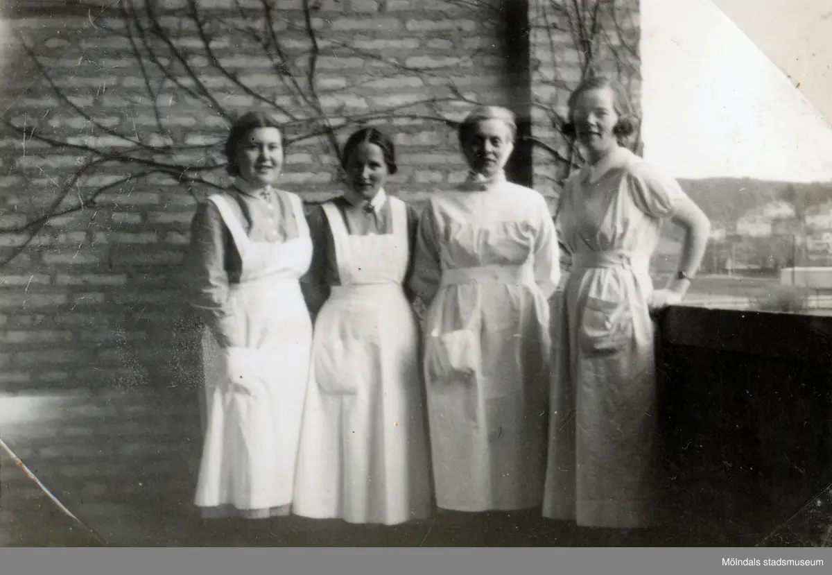 Fyra vårdbiträden/undersköterskor står utomhus i en loftgång framför en tegelvägg med slingerväxter, Mölndals sjukhus 1939 - 1941. Bilder från fotoalbum vid Mölndals lasarett/sjukhus 1939 - 1941 på bland annat givarens mor Ester (född Johansson) tillsammans med kollegan/väninnan Aina Englund. De arbetade på den manliga kirurgavdelningen som vårdbiträden/undersköterskor.