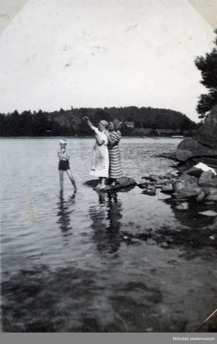 En pojke klädd i badbyxor står i vattnet och två kvinnor står på en sten och vinkar till någon, okänd plats 1939 - 1941. Bilder från fotoalbum, tagna från södra sidan av Länsmansgatan vid Mölndals lasarett/sjukhus 1939 - 1941 på bland annat givarens mor Ester (född Johansson) tillsammans med kollegan/väninnan Aina Englund. De arbetade på den manliga kirurgavdelningen som vårdbiträden/undersköterskor.