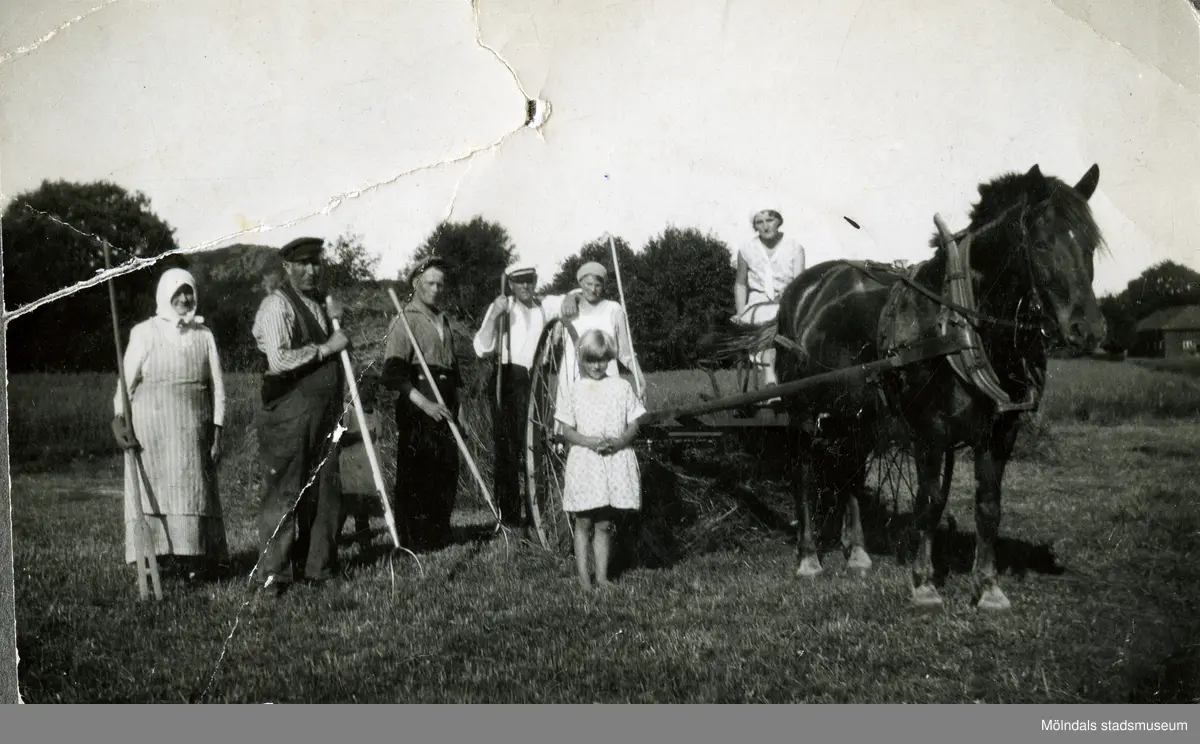 En jordbrukarfamilj bestående av fem vuxna och en flicka (troligtvis Aina Englund) står på en åker med verktyg i händerna, Hällesåker i Lindome cirka 1920. Till höger ses en förspänd arbetshäst och en kvinna som sitter på droskan. Fotot är skadat. Bilder ur fotoalbum från Aina Englund som växte upp ett bland många syskon i en jordbrukarfamilji Lindome.