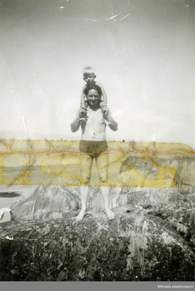 En ung man står på en klippavsats med en liten pojke sittandes på sina axlar. De är klädda i badkläder, troligtvis i Lindome 1940-tal. Fotot är skadat. Bilder ur fotoalbum från Aina Englund som växte upp i en jordbrukarfamilj i Lindome.