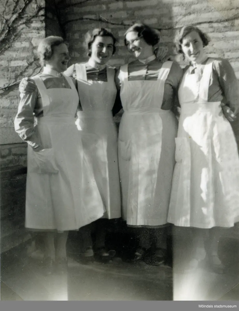 Fyra kvinnliga vårdbiträden/undersköterskor står framför en tegelvägg utanför Mölndals sjukhus 1939 - 1941. Bilder från fotoalbum, tagna från södra sidan av Länsmansgatan vid Mölndals lasarett/sjukhus 1939 - 1941 på bland annat givarens mor Ester (född Johansson) tillsammans med kollegan/väninnan Aina Englund. De arbetade på den manliga kirurgavdelningen som vårdbiträden/undersköterskor.