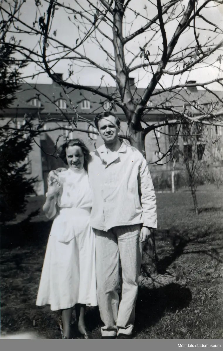 En manlig patient håller om ett kvinnligt sjukvårdsbiträde ståendes på gräsmattan vid ett träd framför Mölndals sjukhus 1939 - 1941. Bilder från fotoalbum, tagna från södra sidan av Länsmansgatan vid Mölndals lasarett/sjukhus 1939 - 1941 på bland annat givarens mor Ester (född Johansson) tillsammans med kollegan/väninnan Aina Englund. De arbetade på den manliga kirurgavdelningen som vårdbiträden/undersköterskor.