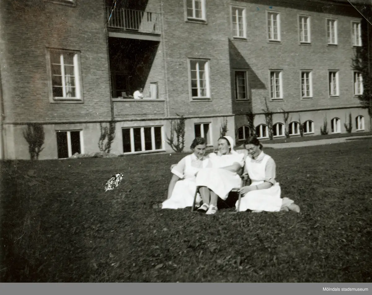 Tre kvinnliga sjukvårdsbiträden har rast och sitter på gräsmattan framför Mölndals sjukhus fasad mot söder, cirka 1940. Något längre till vänster ses en skada på bilden. I bakgrunden ses en manlig patient på en balkong. Bilder från fotoalbum, tagna från södra sidan av Länsmansgatan vid Mölndals lasarett/sjukhus 1939 - 1941 på bland annat givarens mor Ester (född Johansson) tillsammans med kollegan/väninnan Aina Englund. De arbetade på den manliga kirurgavdelningen som vårdbiträden/undersköterskor.