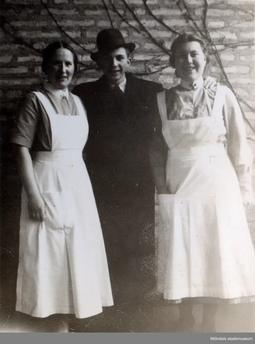 Två sjukvårdsbiträden står på var sin sida om en man som är klädd i hatt och mörk rock. De befinner sig utomhus i en loftgång framför en tegelvägg med slingerväxter, Mölndals sjukhus 1939 - 1941. Bilder från fotoalbum vid Mölndals lasarett/sjukhus 1939 - 1941 på bland annat givarens mor Ester (född Johansson) tillsammans med kollegan/väninnan Aina Englund. De arbetade på den manliga kirurgavdelningen som vårdbiträden/undersköterskor.