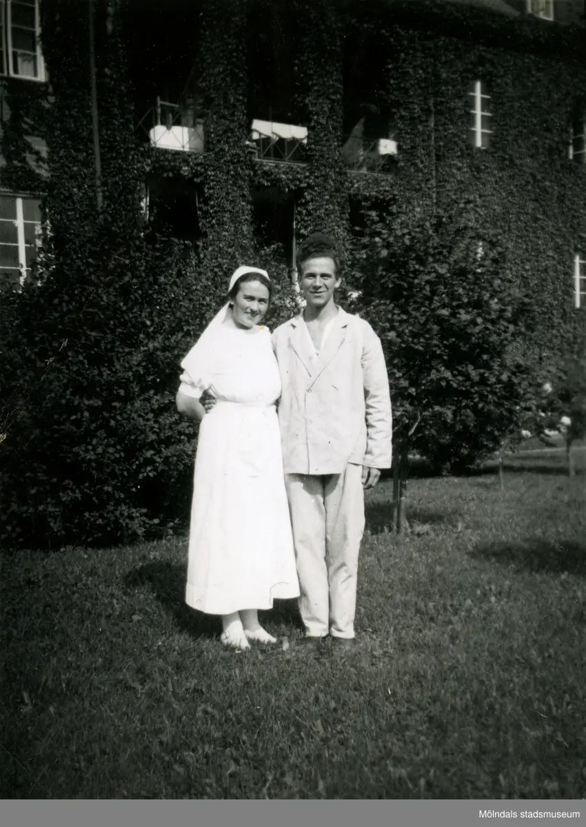 En kvinnlig sjuksköterska och en manlig patient står utomhus framför Mölndals lasarett 1939 - 1941. Bakom dem ses en husfasad täckt av slingerväxter. Bilder från fotoalbum, tagna från södra sidan av Länsmansgatan vid Mölndals lasarett/sjukhus 1939 - 1941 på bland annat givarens mor Ester (född Johansson) tillsammans med kollegan/väninnan Aina Englund. De arbetade på den manliga kirurgavdelningen som vårdbiträden/undersköterskor.
