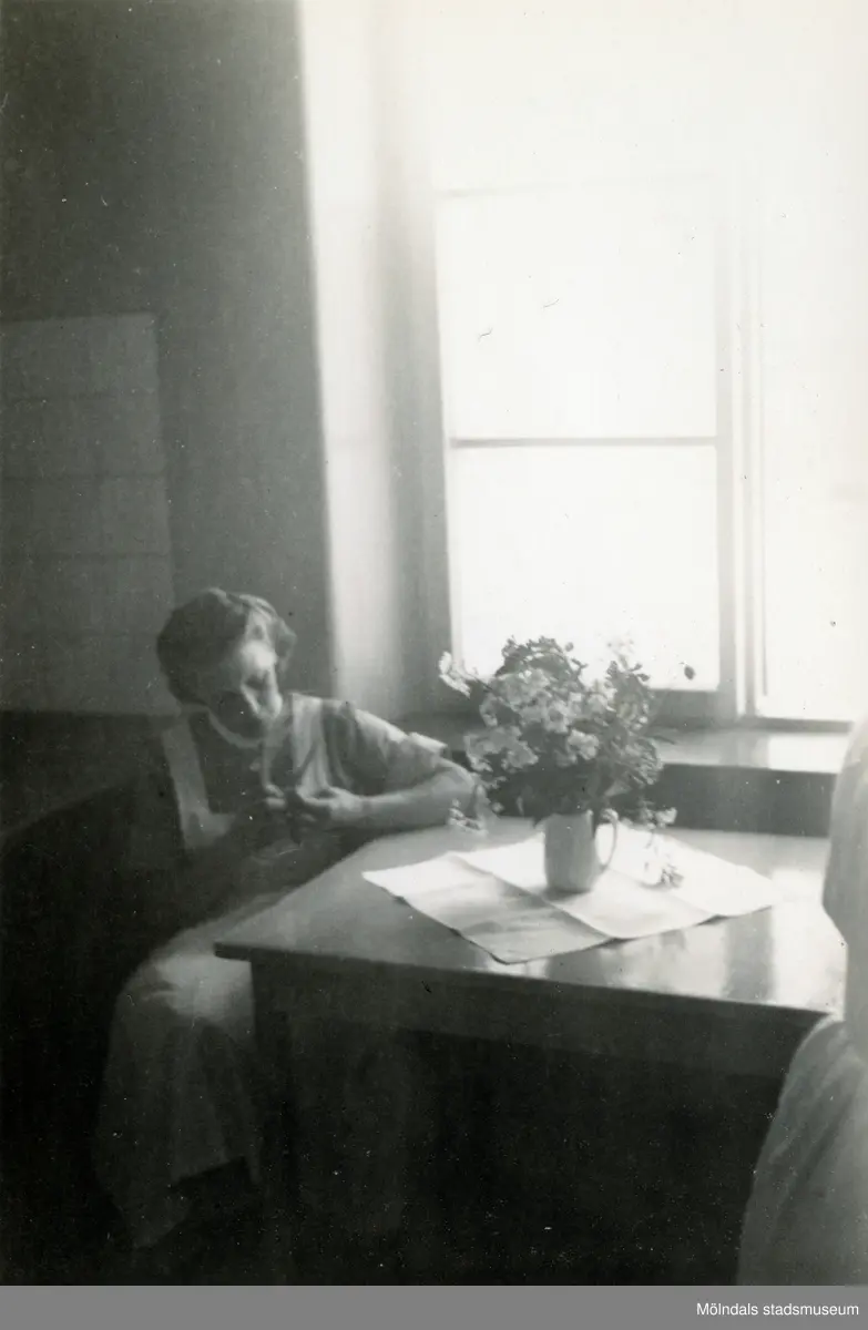 Ett kvinnligt sjukvårdsbiträde sitter vid en köksmöbel i ett kök och filar sina naglar, Mölndals sjukhus 1939 - 1941. Bilder från fotoalbum, tagna från södra sidan av Länsmansgatan vid Mölndals lasarett/sjukhus 1939 - 1941 på bland annat givarens mor Ester (född Johansson) tillsammans med kollegan/väninnan Aina Englund. De arbetade på den manliga kirurgavdelningen som vårdbiträden/undersköterskor.
