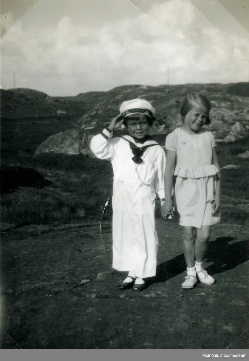 Två små barn står på en bergsknalle, okänd plats 1939 - 1941. Pojken som är klädd i sjömanskläder gör honnör. Flickan bär klänning. Troligtvis barn till Aina Englund (1914 - 2012), vårdbiträde/undersköterska på Mölndals lasarett 1939 - 1941.