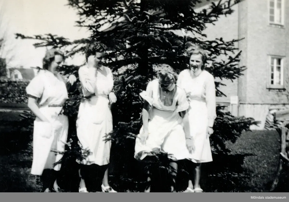 Fyra kvinnliga sjukvårdsbiträden står framför en gran utanför Mölndals sjukhus som ses i bakgrunden, 1939 - 1941. Bilder från fotoalbum, tagna från södra sidan av Länsmansgatan vid Mölndals lasarett/sjukhus 1939 - 1941 på bland annat givarens mor Ester (född Johansson) tillsammans med kollegan/väninnan Aina Englund. De arbetade på den manliga kirurgavdelningen som vårdbiträden/undersköterskor.