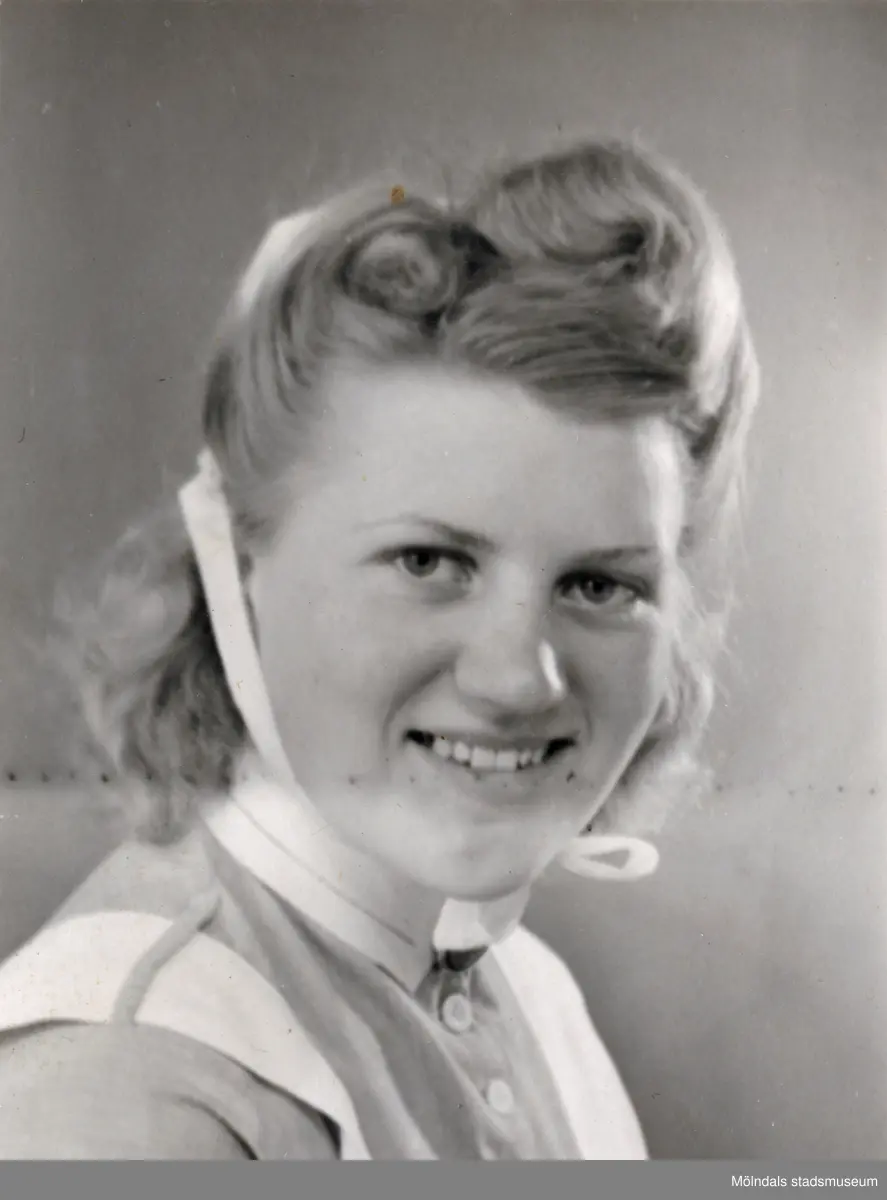 Ateljéporträtt av Aina Englund (1914 - 2012), vårdbiträde/undersköterska på Mölndals lasarett 1939 - 1941. Bilder från fotoalbum, tagna från södra sidan av Länsmansgatan vid Mölndals lasarett/sjukhus 1939 - 1941 på bland annat givarens mor Ester (född Johansson) tillsammans med kollegan/väninnan Aina Englund. De arbetade på den manliga kirurgavdelningen som vårdbiträden/undersköterskor.