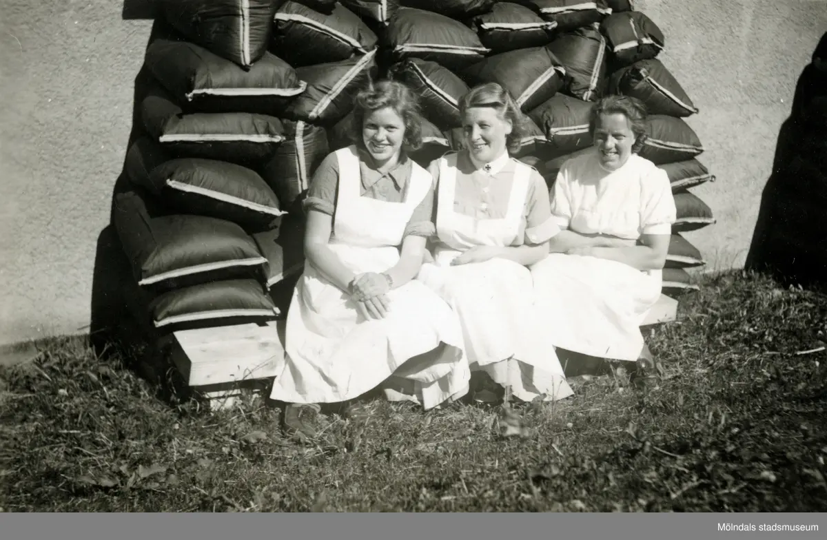 Tre kvinnliga sjukvårdsbiträden sitter på huk i gräset framför några säckar utanför Mölndals sjukhus 1939 - 1941. Bilder från fotoalbum, tagna från södra sidan av Länsmansgatan vid Mölndals lasarett/sjukhus 1939 - 1941 på bland annat givarens mor Ester (född Johansson) tillsammans med kollegan/väninnan Aina Englund. De arbetade på den manliga kirurgavdelningen som vårdbiträden/undersköterskor.