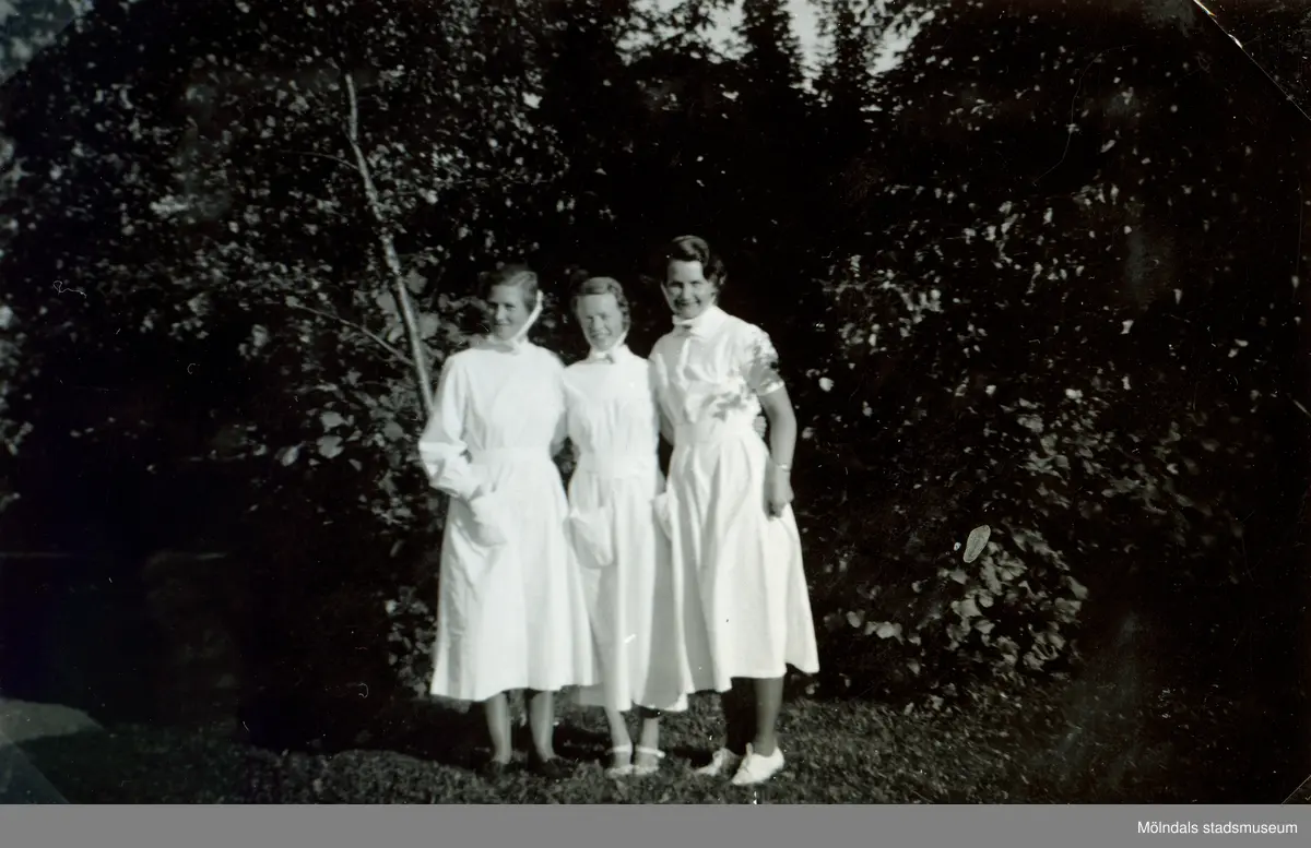 Tre kvinnliga vårdbiträden/undersköterskor står vid en träddunge utanför Mölndals sjukhus 1939 - 1941. Från vänster: Aina Englund (1914 - 2012), okänd kvinna samt Ester Johansson (1914 - 2008, gift Faldahl). Bilder från fotoalbum, tagna från södra sidan av Länsmansgatan vid Mölndals lasarett/sjukhus 1939 - 1941 på bland annat givarens mor Ester (född Johansson) tillsammans med kollegan/väninnan Aina Englund. De arbetade på den manliga kirurgavdelningen som vårdbiträden/undersköterskor.