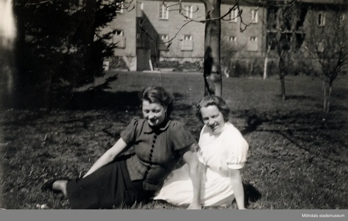 Ester Johansson (1914 - 2008, gift Faldahl) och Aina Englund (1914 - 2012), vårdbiträden/undersköterskor på Mölndals lasarett, sitter på gräsmattan utanför Mölndals sjukhus, 1939 - 1941. Bilder från fotoalbum, tagna från södra sidan av Länsmansgatan vid Mölndals lasarett/sjukhus 1939 - 1941 på bland annat givarens mor Ester (född Johansson) tillsammans med kollegan/väninnan Aina Englund. De arbetade på den manliga kirurgavdelningen som vårdbiträden/undersköterskor.