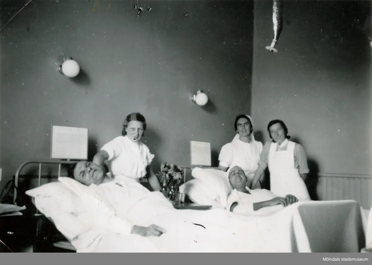 Tre kvinnliga sjukvårdsbiträden står bredvid två manliga patienter som ligger i sina sjuksängar på den manliga kirurgavdelningen, Mölndals sjukhus 1939 - 1941. Stående till vänster är Aina Englund (1914 - 2012), övriga är okända. Baktill på männens sänggavlar sitter temperaturkurvor. Bilder från fotoalbum, tagna från södra sidan av Länsmansgatan vid Mölndals lasarett/sjukhus 1939 - 1941 på bland annat givarens mor Ester (född Johansson) tillsammans med kollegan/väninnan Aina Englund. De arbetade på den manliga kirurgavdelningen som vårdbiträden/undersköterskor.
