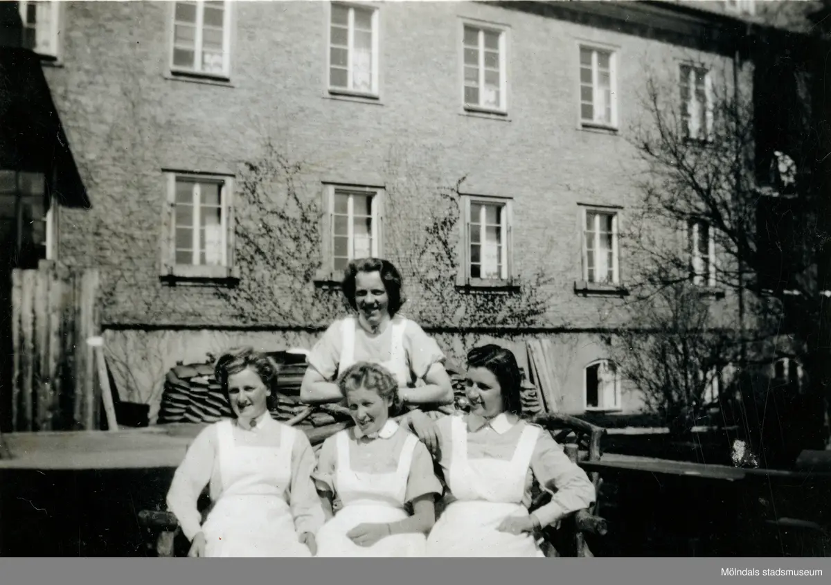 Fyra kvinnliga sjukvårdsbiträden tar en paus utanför Mölndals sjukhus som ses i bakgrunden, 1939 - 1941. Stående är Ester Johansson (1914 - 2008, gift Faldahl) och sittande framför henne i mitten är Aina Englund (1914 - 2012). Bilder från fotoalbum, tagna från södra sidan av Länsmansgatan vid Mölndals lasarett/sjukhus 1939 - 1941 på bland annat givarens mor Ester (född Johansson) tillsammans med kollegan/väninnan Aina Englund. De arbetade på den manliga kirurgavdelningen som vårdbiträden/undersköterskor.